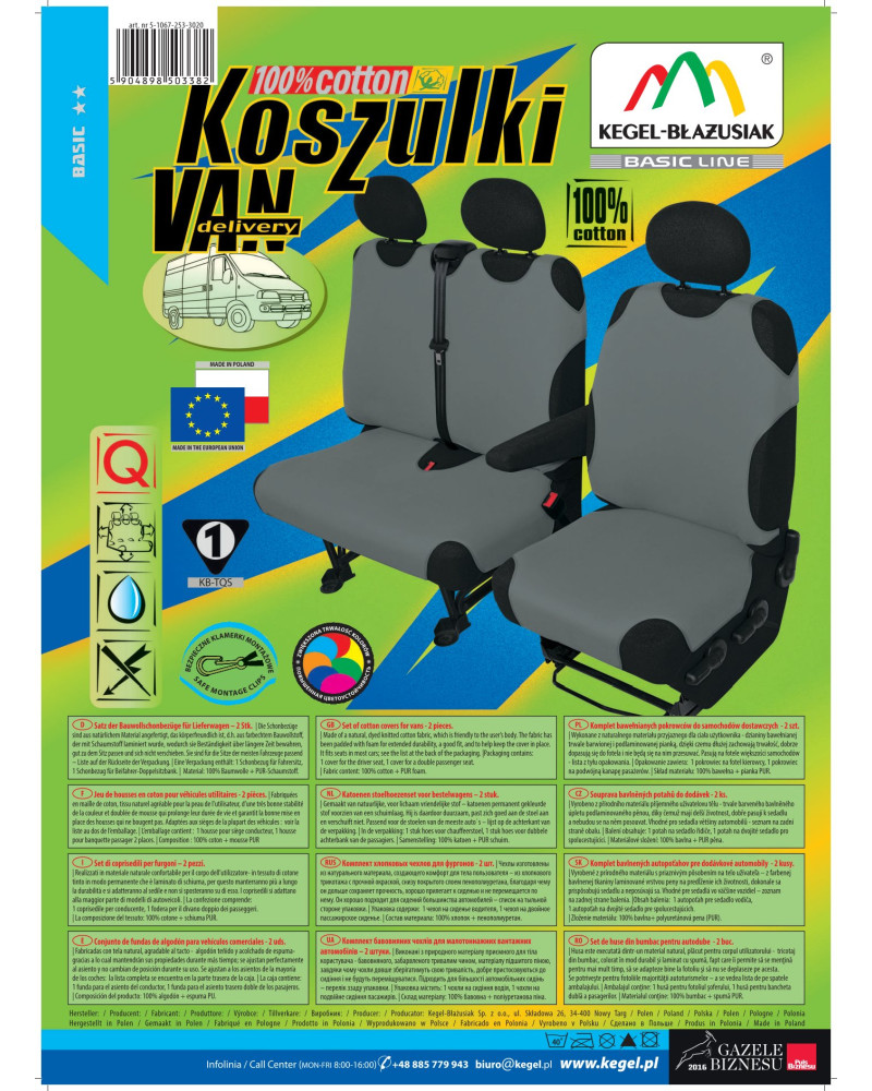 Koszulki COTTON DV (Delivery Van) to pokrowce uniwersalne przeznaczone do samochodów dostawczych, wykonane ze 100% bawełny – wysokogatunkowego, naturalnego materiału. Profesjonalne wykonanie, dbałość o szczegóły i nienaganny wygląd są w stanie zadowolić najbardziej wymagających klientów. Dzięki odpowiedniej budowie, pokrowce dobrze przylegają do siedzeń, a podlaminowanie po wewnętrznej stronie całego materiału pianką PUR, zapobiega ich przesuwaniu. Koszulki pasują prawie na każdy fotel samochodowy. Bardzo łatwo zakłada się je i i szybko ściąga. Bardzo prosto też się je czyści. Pokrowce sprzedajemy w kompletach – w zestawie jest jeden pokrowiec na fotel i jeden na dwuosobową kanapę. Osobno można dokupić też pokrowce na zagłówki. Pokrowce koszulki od lat cieszą się niezmiennym zainteresowaniem wśród klientów. Ochronią i jednocześnie, w sposób bardzo zauważalny, odmienią fotele samochodowe, nadając autu niepowtarzalny charakter.