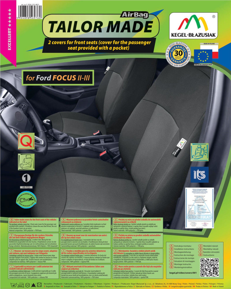The covers have special, secure seams for airbags, making them suitable for cars with both side airbags in the seats and standard seats. Professional workmanship and safety of use are guaranteed by certification and testing by the Motor Transport Institute.