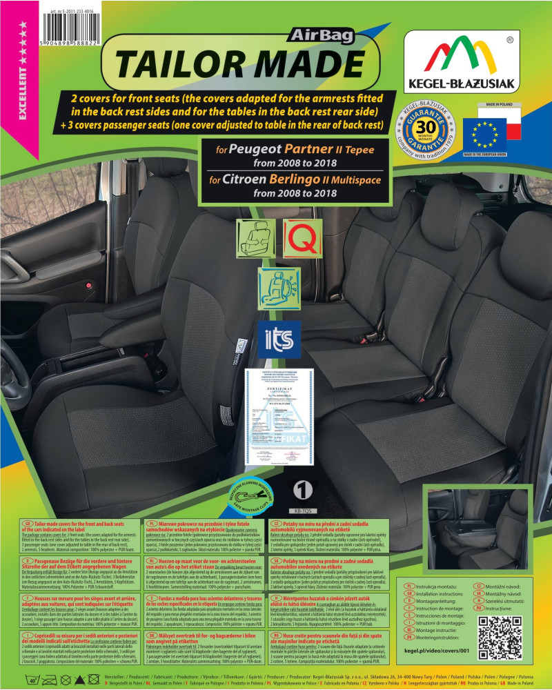 The covers have special, secure seams for airbags, making them suitable for cars with both side airbags in the seats and standard seats. Professional workmanship and safety of use are guaranteed by certification and testing by the Motor Transport Institute.