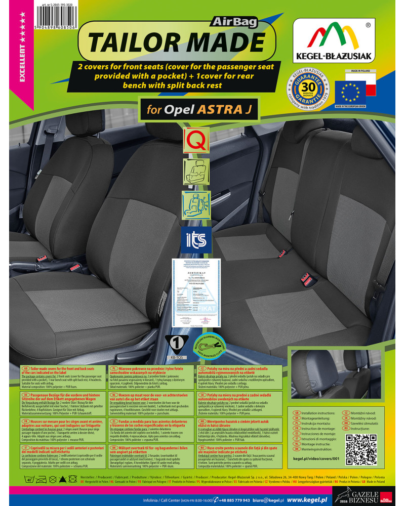 The covers have special, secure seams for airbags, making them suitable for cars with both side airbags in the seats and standard seats. Professional workmanship and safety of use are guaranteed by certification and testing by the Motor Transport Institute.