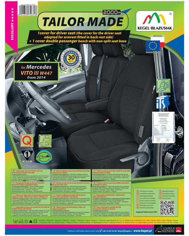 The covers have special, secure seams for airbags, making them suitable for cars with both side airbags in the seats and standard seats. Professional workmanship and safety of use are guaranteed by certification and testing by the Motor Transport Institute.