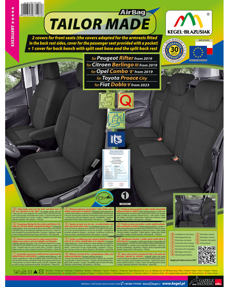 The covers have special, secure seams for airbags, making them suitable for cars with both side airbags in the seats and standard seats. Professional workmanship and safety of use are guaranteed by certification and testing by the Motor Transport Institute.