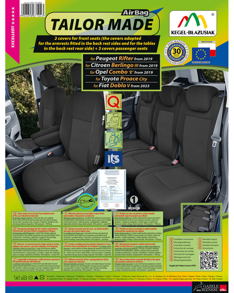 The covers have special, secure seams for airbags, making them suitable for cars with both side airbags in the seats and standard seats. Professional workmanship and safety of use are guaranteed by certification and testing by the Motor Transport Institute.
