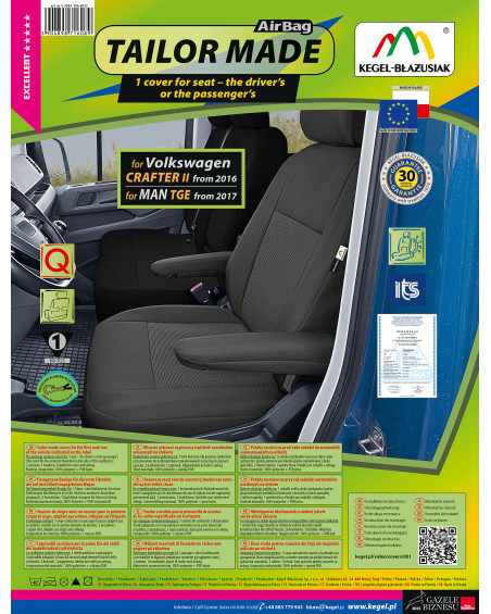 The covers have special, secure seams for airbags, making them suitable for cars with both side airbags in the seats and standard seats. Professional workmanship and safety of use are guaranteed by certification and testing by the Motor Transport Institute.