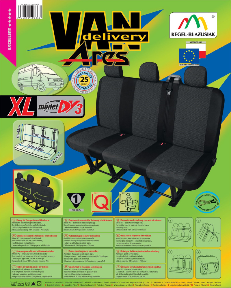 The well-fitting ARES covers are made of high-quality jacquard fabric, which, combined with the careful finishing of even the smallest details, will satisfy the most demanding customers. Thanks to their design, the covers fit the seats well, and the flame-retardant PUR foam laminated on the inside of the entire material prevents them from slipping. The offer is aimed at car owners who want to take care of the interior of their vehicles and add style and elegance. ARES car covers provide excellent protection for the original car upholstery against wear and tear, and their tasteful, classic design creates a positive aesthetic impression. The subdued colour scheme – black with a delicate grey texture – will fit perfectly into the interior of any car. Thanks to their appropriate, spacious design, the covers fit the seats well. The material adheres perfectly to the seats, replacing their original upholstery. These are the exact materials used to make the original seat covers for new vehicles for car factories. The advantage of ARES covers is that they cover the entire rear surface of the backrest. This feature makes them look very good from the back of the seat, while protecting it from dirt and damage (this is especially important for people with small children). Professional workmanship and high-quality materials guarantee a long service life.