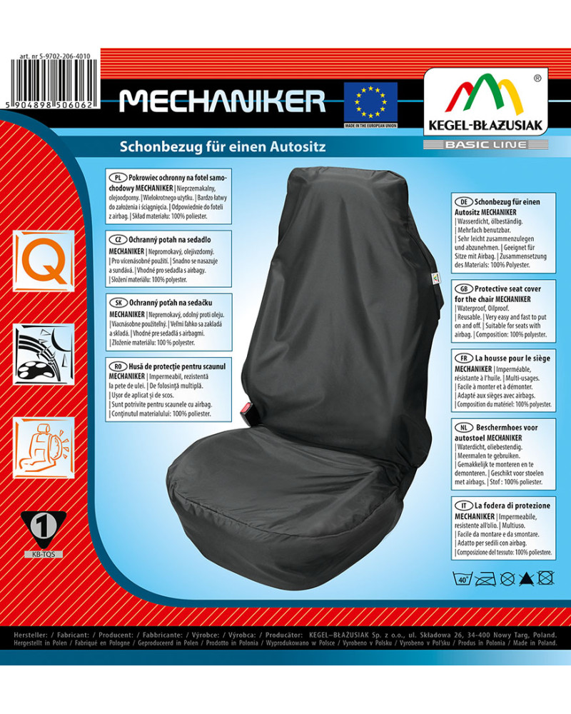 The MECHANIKER protective cover is a front seat cover for car mechanics and people who drive in dirty work clothes. The cover is made of high-quality, water-resistant nylon, which increases its durability and makes it washable. The cover is suitable for seats with side airbags AirBag. Made in a universal size, it fits all standard car seats. An eco-friendly product - can be reused many times. Very easy to clean – light stains can be wiped with a damp cloth and cleaning fluid, while heavier stains can be washed by hand at 40°C. Very quick to put on and take off; easy to fold and transport.