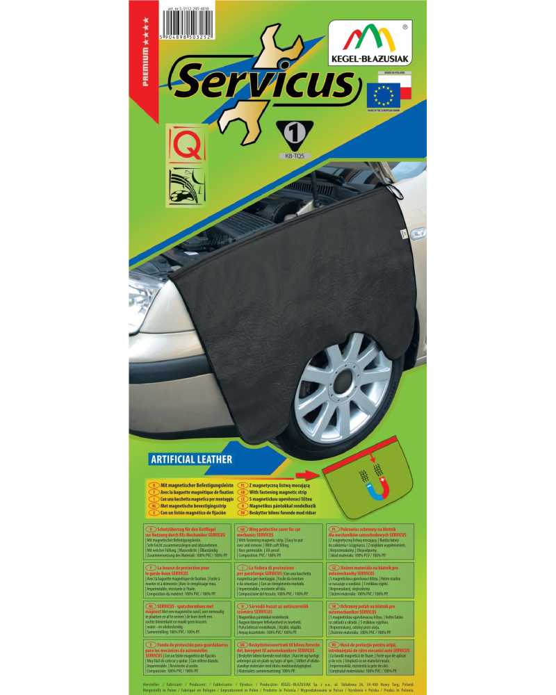 Protective cover – service cover, ideal for use in car repair shops and service centres. It protects the fender of the car being repaired from damage and dirt, while increasing the comfort of the mechanic's work. The cover has soft padding. The inside is lined with a delicate non-woven fabric that prevents scratching of the car body and mudguard. It is very easy to install using sewn-in magnetic strips - just place the cover on the mudguard. The SERVICUS protective cover is made in a universal black colour, which makes it look good and is extremely practical to use. The appropriate design of the cover protects the entire mudguard and the sides of the car. The product is very easy to clean. Any dirt can be easily removed with a damp cloth and liquid.