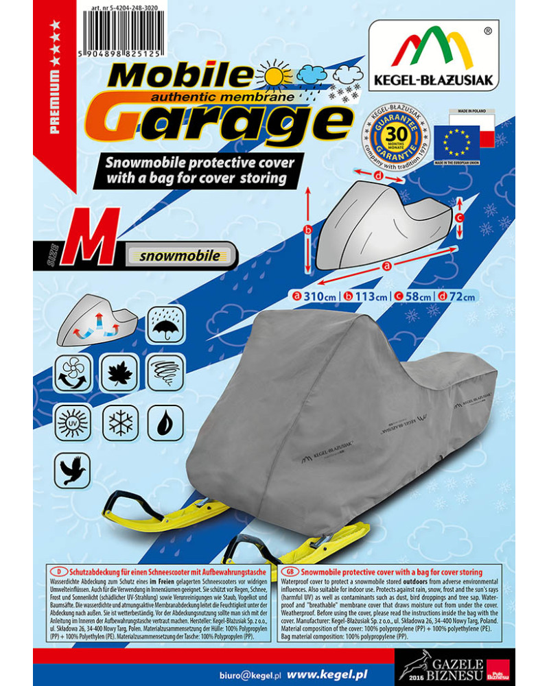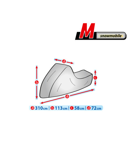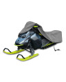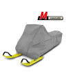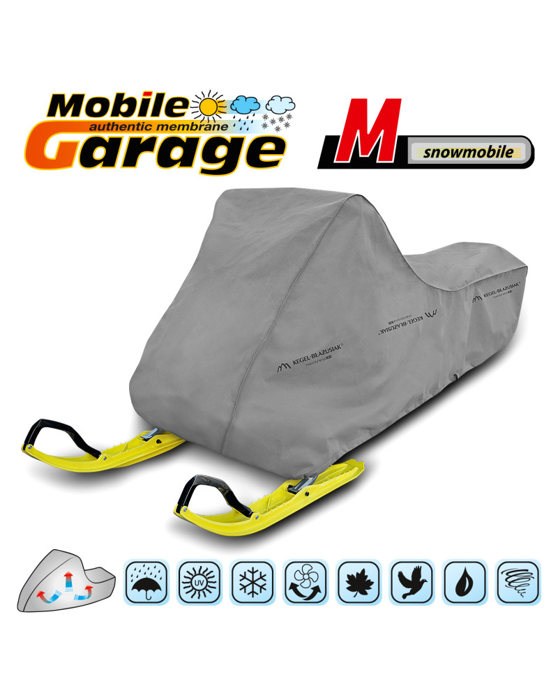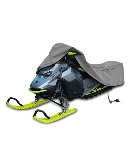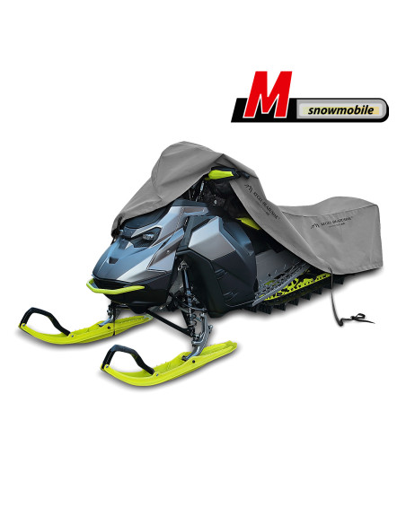 Waterproof cover to protect a snowmobile stored outdoors from adverse environmental influences. Also suitable for indoor use. Protects against rain, snow, frost and the sun's rays (harmful UV) as well as contaminants such as dust, bird droppings and tree sap. Waterproof and "breathable" membrane cover that draws moisture out from under the cover.