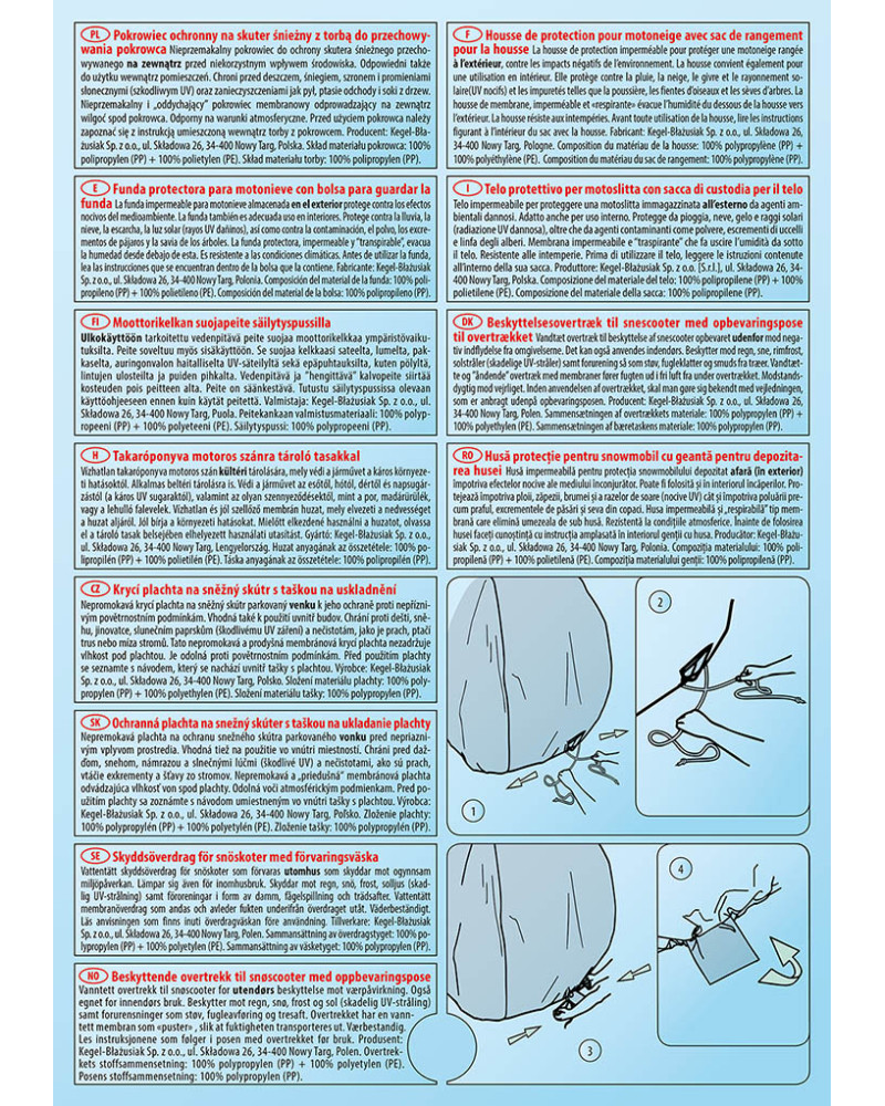 Place the cover on a clean and dry snowmobile with the printed side facing outwards. To facilitate the right positioning of the cover on the snowmobile, the label marked “ FRONT” has been sewn into the cover on the front and the label marked “REAR” into the back of the cover (the markings correspond to the front and back of the snowmobile). Cross the drawcords to form the first knot, then tighten the drawcords firmly, directing the forces parallel to the rear edge of the vehicle (see figure 2 on the outer label of the cover). Tie the drawcords and check that the knot does not loosen when the cord is pulled. If the knot loosens, repeat the process, changing the tying method. There are tie-down straps sewn into the lower edge of the cover, all of which need to be threaded underneath the snowmobile, then the tie-down straps need to be buckled and tightened.