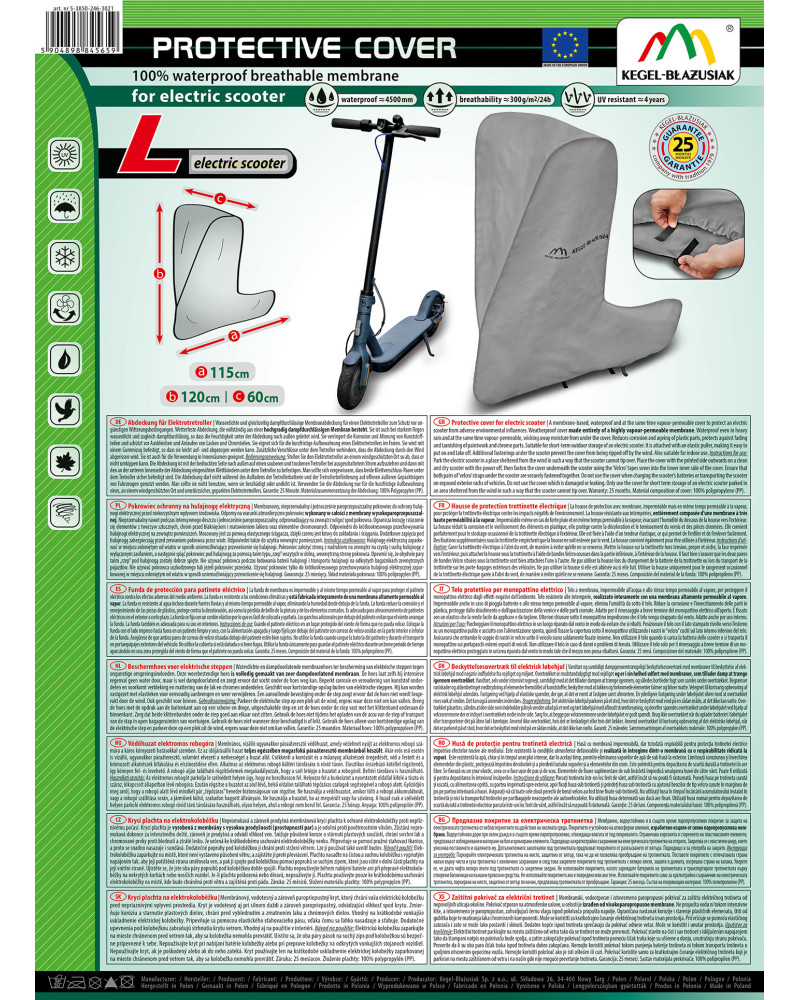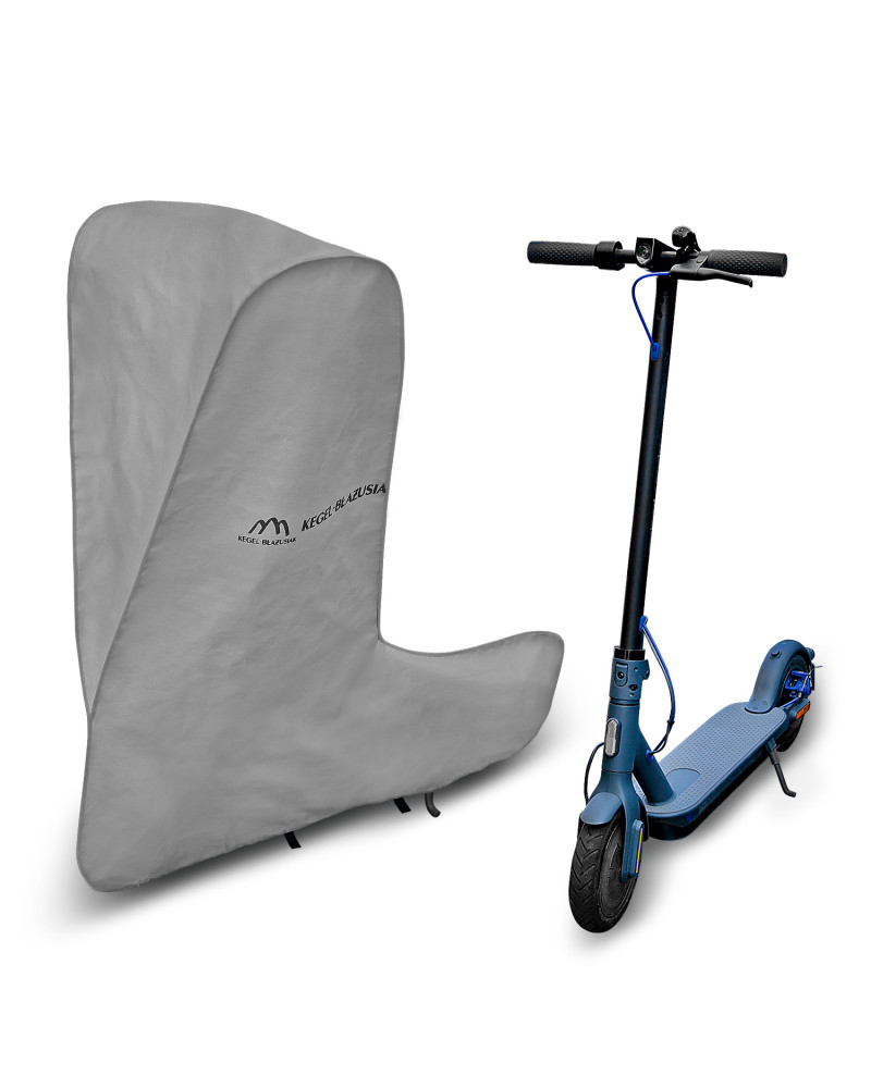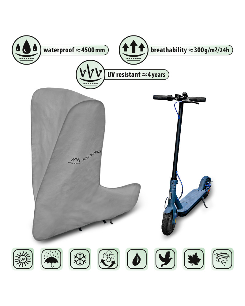 A membrane-based, waterproof and at the same time vapour-permeable cover to protect an electric scooter from adverse environmental influences. Weatherproof cover made entirely of a highly vapour-permeable membrane. Waterproof even in heavy rain and at the same time vapour-permeable, wicking away moisture from under the cover. Reduces corrosion and ageing of plastic parts, protects against fading and tarnishing of paintwork and chrome parts. Suitable for short-term outdoor storage of an electric scooter. It is attached with an elastic puller, making it easy to put on and take off. Additional fastenings under the scooter prevent the cover from being ripped off by the wind. Also suitable for indoor use.