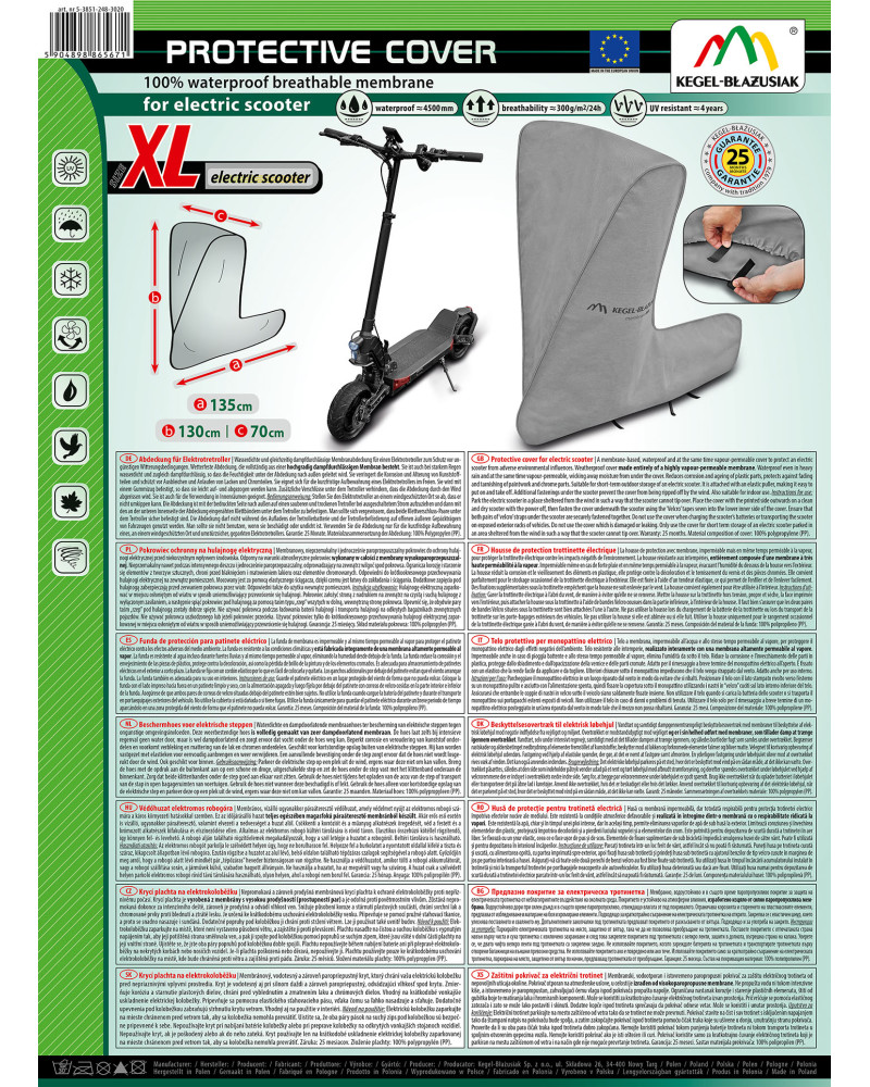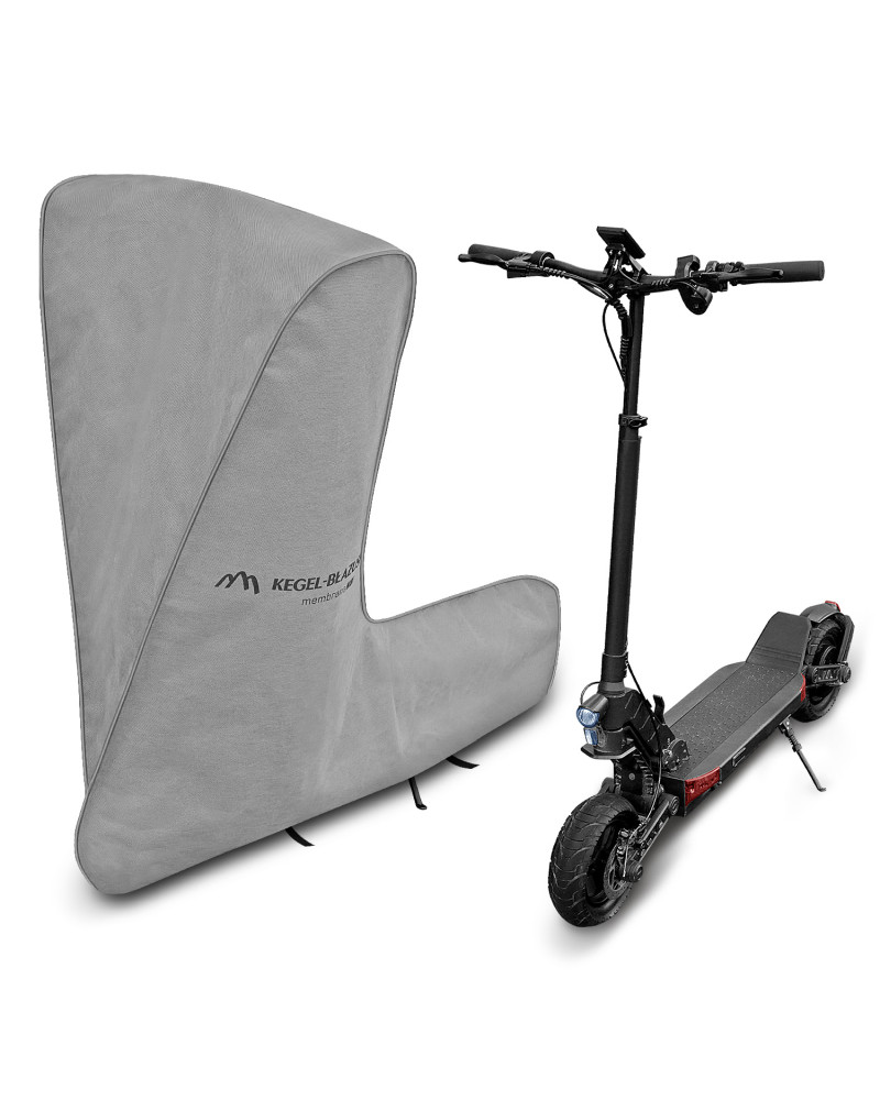 A membrane-based, waterproof and at the same time vapour-permeable cover to protect an electric scooter from adverse environmental influences. Weatherproof cover made entirely of a highly vapour-permeable membrane. Waterproof even in heavy rain and at the same time vapour-permeable, wicking away moisture from under the cover. Reduces corrosion and ageing of plastic parts, protects against fading and tarnishing of paintwork and chrome parts. Suitable for short-term outdoor storage of an electric scooter. It is attached with an elastic puller, making it easy to put on and take off. Additional fastenings under the scooter prevent the cover from being ripped off by the wind. Also suitable for indoor use.
