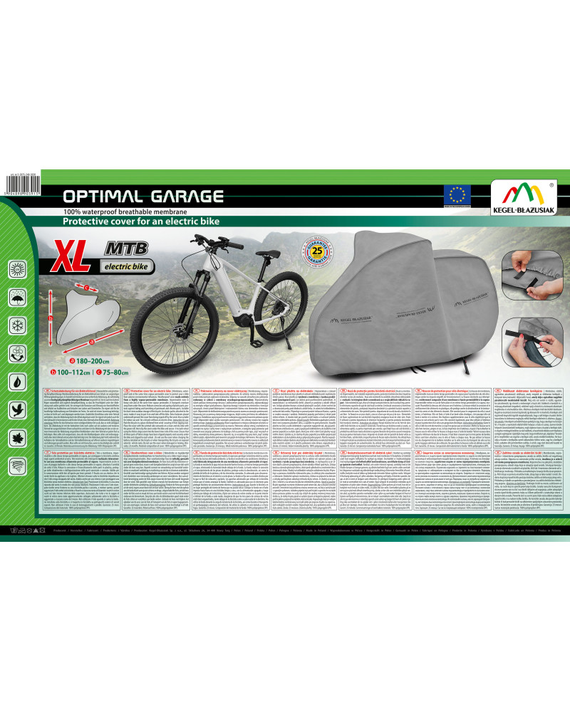Park the bicycle in a place sheltered from wind securing it from tipping over. Place the cover with the printed side outwards on a clean and dry bike with the power off, then clip the cover under the bike and secure it to each wheel using the Velcro straps sewn into the lower inner side of the cover. Ensure that all three pairs of Velcro straps have been clipped properly and securely under the bike and clipped to each wheel . Do not use the cover when charging the acumulator/battery installed on the bicycle or when transporting the bicycle on exposed external vehicle racks. Do not use the cover when damaged or leaking.