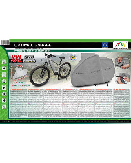 Park the bicycle in a place sheltered from wind securing it from tipping over. Place the cover with the printed side outwards on a clean and dry bike with the power off, then clip the cover under the bike and secure it to each wheel using the Velcro straps sewn into the lower inner side of the cover. Ensure that all three pairs of Velcro straps have been clipped properly and securely under the bike and clipped to each wheel . Do not use the cover when charging the acumulator/battery installed on the bicycle or when transporting the bicycle on exposed external vehicle racks. Do not use the cover when damaged or leaking.