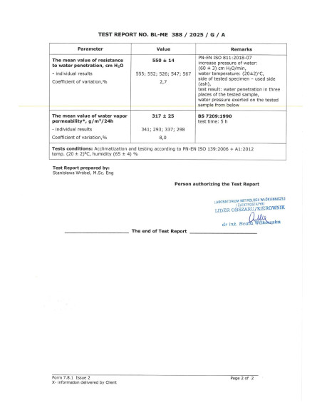 A vapour permeability rating of 317 means that 317 g of water vapour passed through one square metre of KB Textil 400 grey membrane in 24 hours at a temperature of approx. 20 degrees Celsius. Waterproofness with a score of 550 means that the KB Textil 400 grey membrane only became wet at a water column height of 550 cm (i.e. 5500 mm), which means that the membrane is completely waterproof even during heavy and prolonged rain.