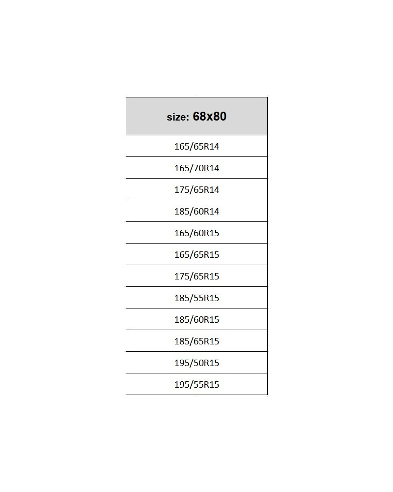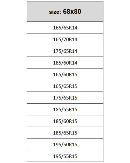 165/65R14, 165/70R14, 175/65R14, 185/60R14, 165/60R15, 165/65R15, 175/65R15, 185/55R15, 185/60R15, 185/65R15, 195/50R15, 195/55R15.