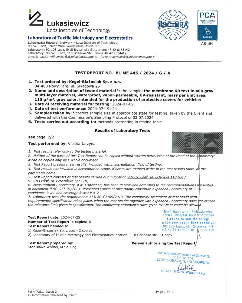 The durability of the tarpaulins is determined by their resistance to sunlight (UV), high temperatures, rain, frost, snow and natural dirt. Our specialists have developed effective methods for testing the resistance of materials to outdoor conditions based on their long-standing environmental tests and test standards PN-EN ISO 4892-3. Every batch of materials from which Kegel-Błażusiak covers are produced is carefully examined in the Atlas UVtest ageing chamber from the USA. Thanks to the quality control of materials and long-term environmental tests, we guarantee our customers several years of the durability of our tarpaulins and covers even in intensive use.