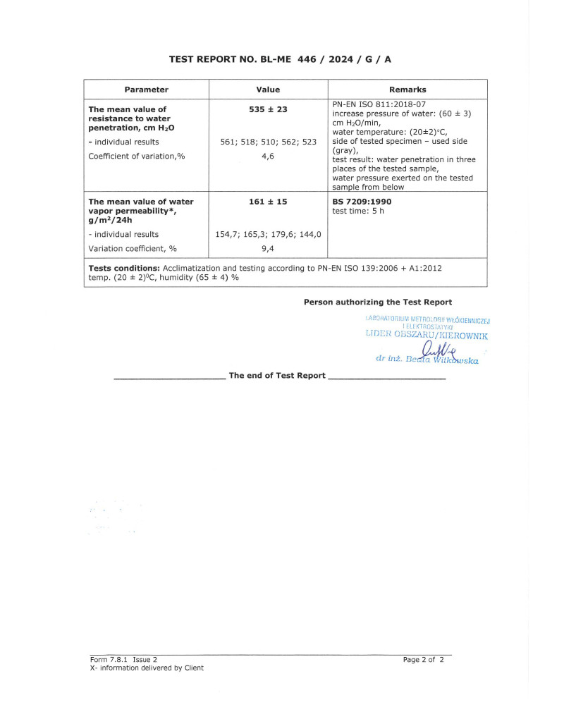 A vapour permeability rating of 317 means that 317 g of water vapour passed through one square metre of KB Textil 400 grey membrane in 24 hours at a temperature of approx. 20 degrees Celsius. Waterproofness with a score of 550 means that the KB Textil 400 grey membrane only became wet at a water column height of 550 cm (i.e. 5500 mm), which means that the membrane is completely waterproof even during heavy and prolonged rain.